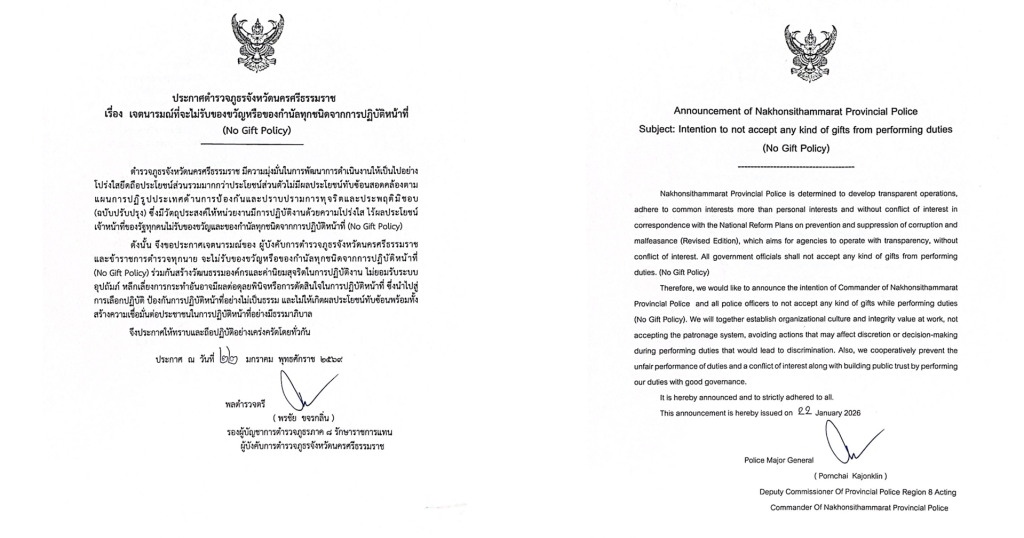 - ประกาศสำนักงานยุทธศาสตร์ตำรวจเรื่องเจตนารมณ์ในการป้องกันการทุจริตและเจตจำนงสุจริตในการบริหารงาน