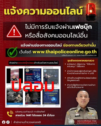 ตร. เตือน แจ้งความออนไลน์มีที่เดียวคือ www.thaipoliceonline.go.th เท่านั้น ไม่มีรับแจ้งผ่านเฟซบุ๊ก January 9, 2567 by admin / ข่าวประชาสัมพันธ์ Facebook iconFacebookTwitter iconTwitterLINE iconLine