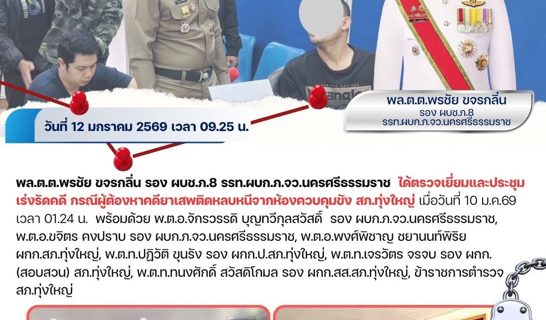 💠ได้ตรวจเยี่ยมและประชุมเร่งรัดคดี กรณีผู้ต้องหาคดียาเสพติดหลบหนีจากห้องควบคุมขัง สภ.ทุ่งใหญ่ เมื่อวันที่ 10 ม.ค.69 เวลา 01.24 น.