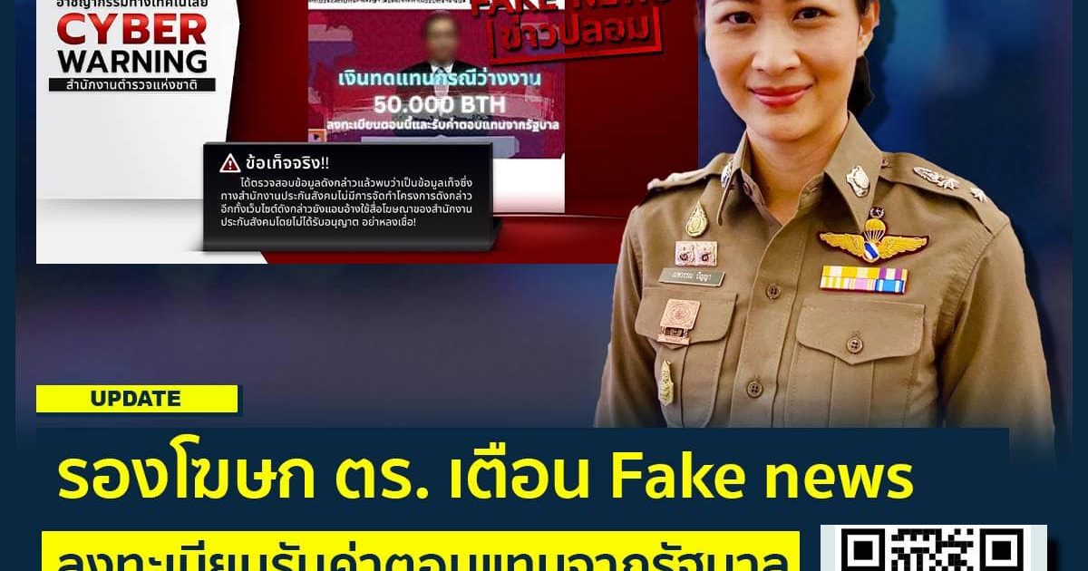 พ.ต.ท.หญิง ณพวรรณฯ กล่าวว่า ขณะนี้บนโซเชียลมีเดียได้มีการแชร์ข้อความโดยระบุ “ลงทะเบียนรับค่าตอบแทนจากรัฐบาล 50,000 บาท เพื่อช่วยเหลือการว่างงานสำหรับทุกครอบครัว” ศูนย์ต่อต้านข่าวปลอมประเทศไทย (Anti-Fake News Center Thailand) ได้ตรวจสอบไปที่สำนักงานประกันสังคม กระทรวงแรงงาน แล้วพบว่าเป็นข้อมูลเท็จ ทางสำนักงานประกันสังคมไม่มีการจัดทำโครงการดังกล่าว อีกทั้งเว็บไซต์ดังกล่าวยังแอบอ้างใช้สื่อโฆษณาของสำนักงานประกันสังคม โดยไม่ได้รับอนุญาต ทำให้หลงเชื่อว่าสำนักงานประกันสังคมมีส่วนเกี่ยวข้อง เป็นการทำให้ประชาชนเกิดความเข้าใจผิด อาจตกเป็นเหยื่อของมิจฉาชีพได้ ซึ่งการผลิตข่าวปลอม สร้างข่าวบิดเบือน ทำให้ประเทศชาติเสียหาย ประชาชนสับสน