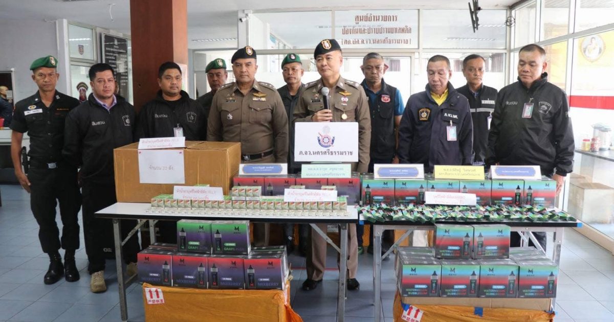 วันที่ 25 ก.พ.68 เวลา 14.00 น. พล.ต.ต.จารุต ศรุตยาพร ผบก.ภ.จว.นครศรีธรรมราช พร้อมด้วย พ.ต.อ.เกรียงศักดิ์ นุ่นเกลี้ยง รอง ผบก.ภ.จว. นครศรีธรรมราช, พ.ต.อ.ขจิตร คงปราบ รอง ผบก.ภ.จว.นครศรีธรรมราช, พ.ต.อ.นัษฐวุฒิ ทองทิพย์ รอง ผบก.ภ.จว.นครศรีธรรมราช, พ.ต.อ.สุทัศน์ สงสยม รอง ผบก.ภ.จว.นครศรีธรรมราช, พ.ต.อ.พิศิษฐ์ วิเศษวงศ์ ผกก.สส.ภ.จว.นครศรีธรรมราช, พ.ต.ท.นพเสถียร สิงห์สุขพนธ์ รอง ผกก.สส.ภ.จว.นครศรีธรรมราช พร้อมชุดจับกุม ได้ร่วมกันแถลงข่าวผลการจับกุมบุหรี่ไฟฟ้าในพื้นที่จังหวัดนครศรีธรรมราช ซึ่งสามารถตรวจยึดของกลางเป็นรถบรรทุก 10 ล้อ ไม่ประจำทางใช้ในการขนส่งบุหรี่ไฟฟ้า และ น้ำยาหัวเปลี่ยนบุหรี่ไฟ้ฟา รวมมูลค่าของกลางประมาณ 11,968,000 บาท