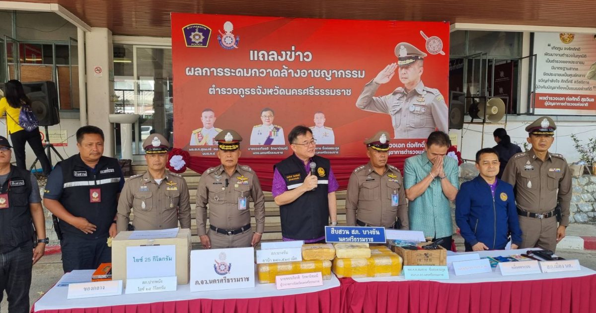 วันที่ 6 ก.พ.67 เวลา 13.00 น. ตำรวจภูธรจังหวัดนครศรีธรรมราช ได้จัดให้มีการแถลงข่าวนำโดย นายขจรเกียรติ รักพานิชมณี ผู้ว่าราชการจังหวัดนครศรีธรรมราช พร้อมด้วย พล.ต.ต.สมชาย ซื่อต่อตระกูล ผบก.ภ.จว.นครศรีธรรมราช ร่วมกันแถลงข่าว ผลการตรวจยึดยาไอซ์ จำนวน 25 กก.พื้นที่ สภ.ปากพนัง และจับกุมยาบ้า จำนวน 240,518 เม็ด พื้นที่ สภ.บางขัน และผลการจับกุมผู้ต้องหาร่วมกันทวงถามหนี้ในลักษณะการข่มขู่ลูกหนี้เข้าข่ายหนี้นอกระบบ พื้นที่ สภ.เมืองนครศรีธรรมราช