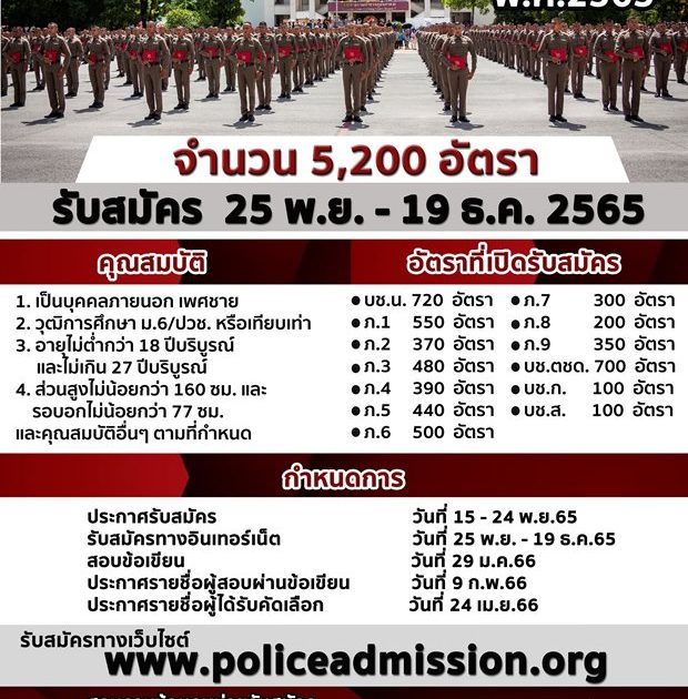 สำนักงานตำรวจแห่งชาติ เปิดรับสมัครบุคคลภายนอกฯ เพื่อบรรจุเป็นนักเรียนนายสิบตำรวจ พ.ศ.2565 จำนวน 5,200 อัตรา November 10, 2565 by admin / ข่าวประชาสัมพันธ์ ประกาศรับสมัคร ระหว่างวันที่ 15-24 พ.ย.65 ทางเว็บไซต์ www.policeadmission.org รับสมัคร ระหว่างวันที่ 25 พ.ย. – 19 ธ.ค.65 ทางเว็บไซต์ www.policeadmission.org Facebook iconFacebookTwitter iconTwitterLINE iconLine