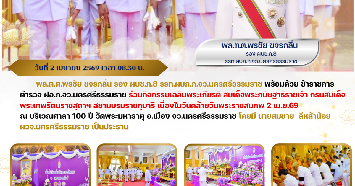 ️วันที่ 2 เม.ย.69 เวลา 08.30 น. พล.ต.ต.พรชัย ขจรกลิ่น รอง ผบช.ฯ รรท.ผบก.ภ.จว.นครศรีธรรมราช พร้อมด้วย 🔸 ข้าราชการตำรวจ ฝอ.ภ.จว.นครศรีธรรมราช 💠ร่วมกิจกรรมเฉลิมพระเกียรติ สมเด็จพระกนิษฐาธิราชเจ้า กรมสมเด็จพระเทพรัตนราชสุดาฯ สยามบรมราชกุมารี เนื่องในวันคล้ายวันพระราชสมภพ 2 เม.ย.69 ณ บริเวณศาลา 100 ปี วัดพระมหาธาตุ อ.เมือง จว.นครศรีธรรมราช โดยมี นายสมชาย ลีหล้าน้อย ผวจ.นครศรีธรรมราช เป็นประธาน