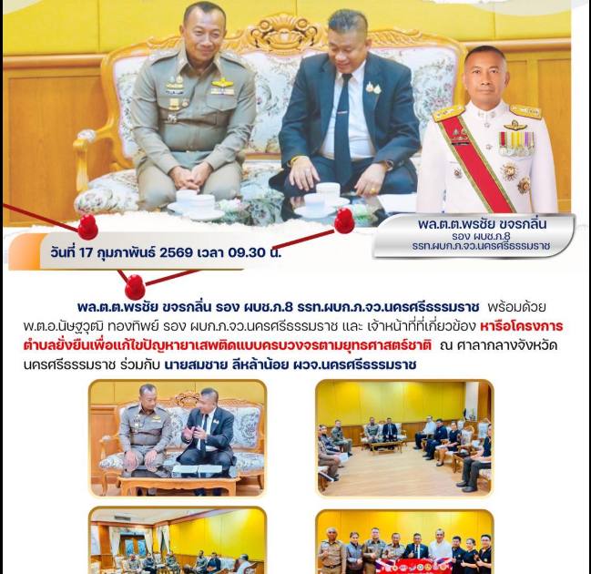 17 ก.พ.69 เวลา 09.30 น. พล.ต.ต.พรชัย ขจรกลิ่น รอง ผบช.ภ.8 รรท.ผบก.ภ.จว.นครศรีธรรมราช พร้อมด้วย พ.ต.อ.นัษฐวุฒิ ทองทิพย์ รอง ผบก.ภ.จว.นครศรีธรรมราช และเจ้าหน้าที่ที่เกี่ยวข้อง ร่วมหารือโครงการตำบลยั่งยืนเพื่อแก้ไขปัญหายาเสพติดแบบครบวงจรตามยุทธศาสตร์ชาติ ร่วมกับนายสมชาย ลีหล้าน้อย ผวจ.นครศรีธรรมราช ณ ศาลากลางจังหวัดนครศรีธรรมราช