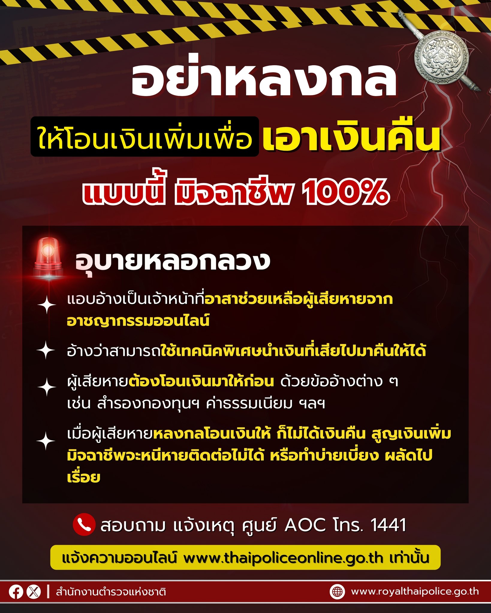 มิจฯ ให้โอนเงินเพิ่ม เพื่อเอาเงินคืน ( จากมิจฯ ) หากเจอแบบนี้ มิจฯ ชัวร์ 100% #ไม่เชื่อ#ไม่โอน อ่านต่อคลิก https://www.facebook.com/share/p/2T8ZFpW4mhf3aPF7