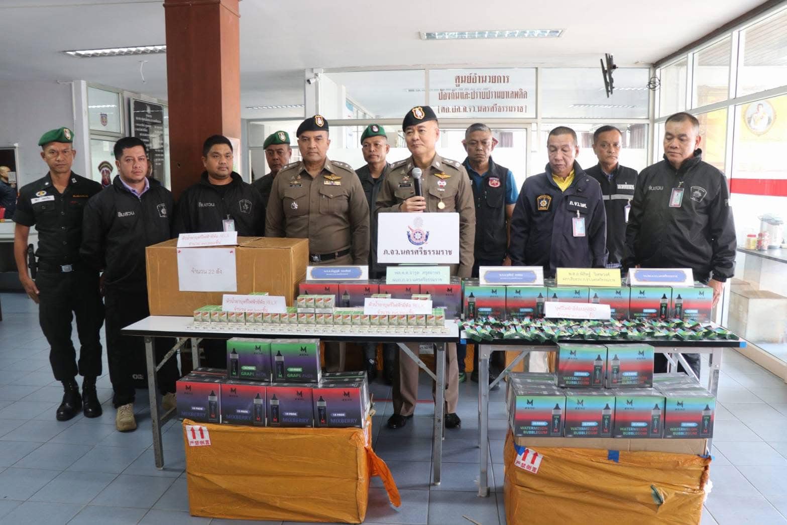 วันที่ 25 ก.พ.68 เวลา 14.00 น. พล.ต.ต.จารุต ศรุตยาพร ผบก.ภ.จว.นครศรีธรรมราช พร้อมด้วย พ.ต.อ.เกรียงศักดิ์ นุ่นเกลี้ยง รอง ผบก.ภ.จว. นครศรีธรรมราช, พ.ต.อ.ขจิตร คงปราบ รอง ผบก.ภ.จว.นครศรีธรรมราช, พ.ต.อ.นัษฐวุฒิ ทองทิพย์ รอง ผบก.ภ.จว.นครศรีธรรมราช, พ.ต.อ.สุทัศน์ สงสยม รอง ผบก.ภ.จว.นครศรีธรรมราช, พ.ต.อ.พิศิษฐ์ วิเศษวงศ์ ผกก.สส.ภ.จว.นครศรีธรรมราช, พ.ต.ท.นพเสถียร สิงห์สุขพนธ์ รอง ผกก.สส.ภ.จว.นครศรีธรรมราช พร้อมชุดจับกุม ได้ร่วมกันแถลงข่าวผลการจับกุมบุหรี่ไฟฟ้าในพื้นที่จังหวัดนครศรีธรรมราช ซึ่งสามารถตรวจยึดของกลางเป็นรถบรรทุก 10 ล้อ ไม่ประจำทางใช้ในการขนส่งบุหรี่ไฟฟ้า และ น้ำยาหัวเปลี่ยนบุหรี่ไฟ้ฟา รวมมูลค่าของกลางประมาณ 11,968,000 บาท