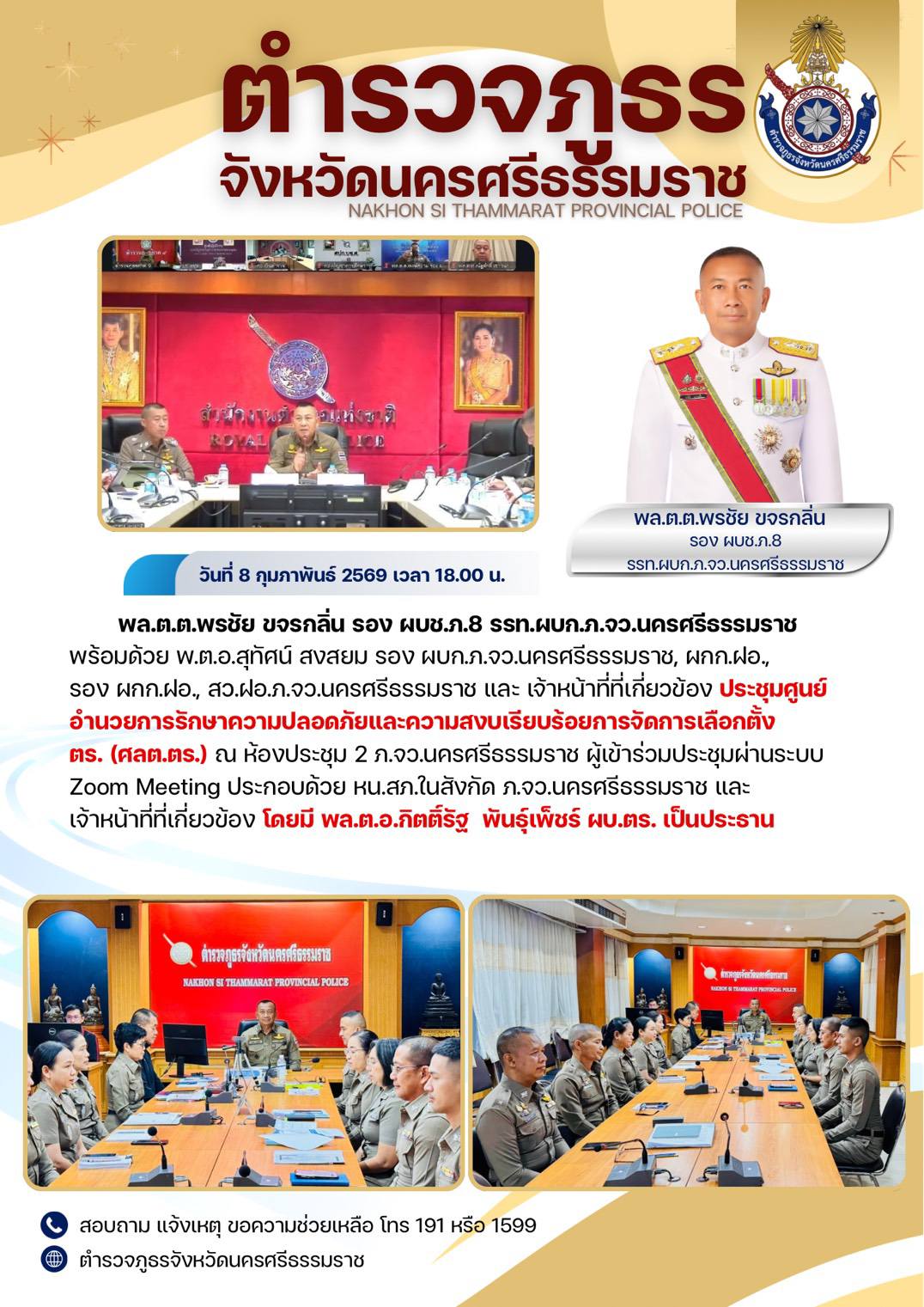 วันที่ 8 ก.พ 69 เวลา 18.00 น. พล.ต.ต.พรชัย ขจรกลิ่น รอง ผบช.ฯ รรท.ผบก.ภ.จว.นครศรีธรรมราช ประชุมศูนย์อำนวยการรักษาความปลอดภัยและความสงบเรียบร้อยการจัดการเลือกตั้ง ตร. (ศลต.ตร.) ณ ห้องประชุม 2 ภ.จว.นครศรีธรรมราช February 9, 2569 by admin