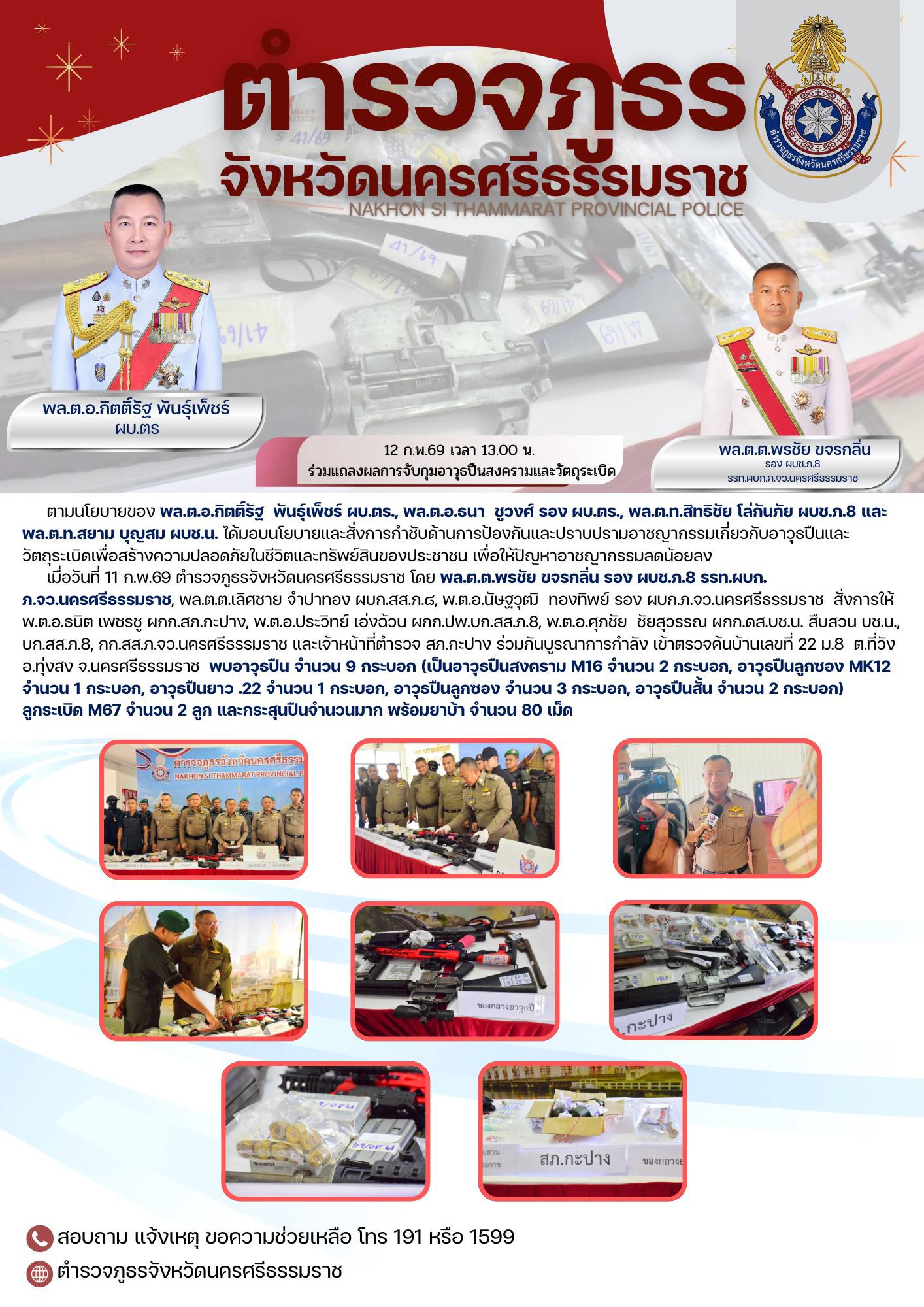 วันที่ 12 ก.พ.69 เวลา 13.00 น พล.ต.ต.พรชัย ขจรกลิ่น รอง ผบช.ฯ รรท.ผบก.ภ.จว.นครศรีธรรมราช แถลงข่าว กรณีเมื่อวันที่ 11 ก.พ.2569 มีการจับกุมผู้ต้องหา พร้อมด้วยของกลาง ยาเสพติด และอาวุธปืนพร้อมเครื่องกระสุนปืน ในพื้นที่ สภ.กะปาง จว.นครศรีธรรมราช ตามคดีอาญา ที่ 38/2569, 39 /2569, 40/2569 และ 41/2569 February 13, 2569 by admin