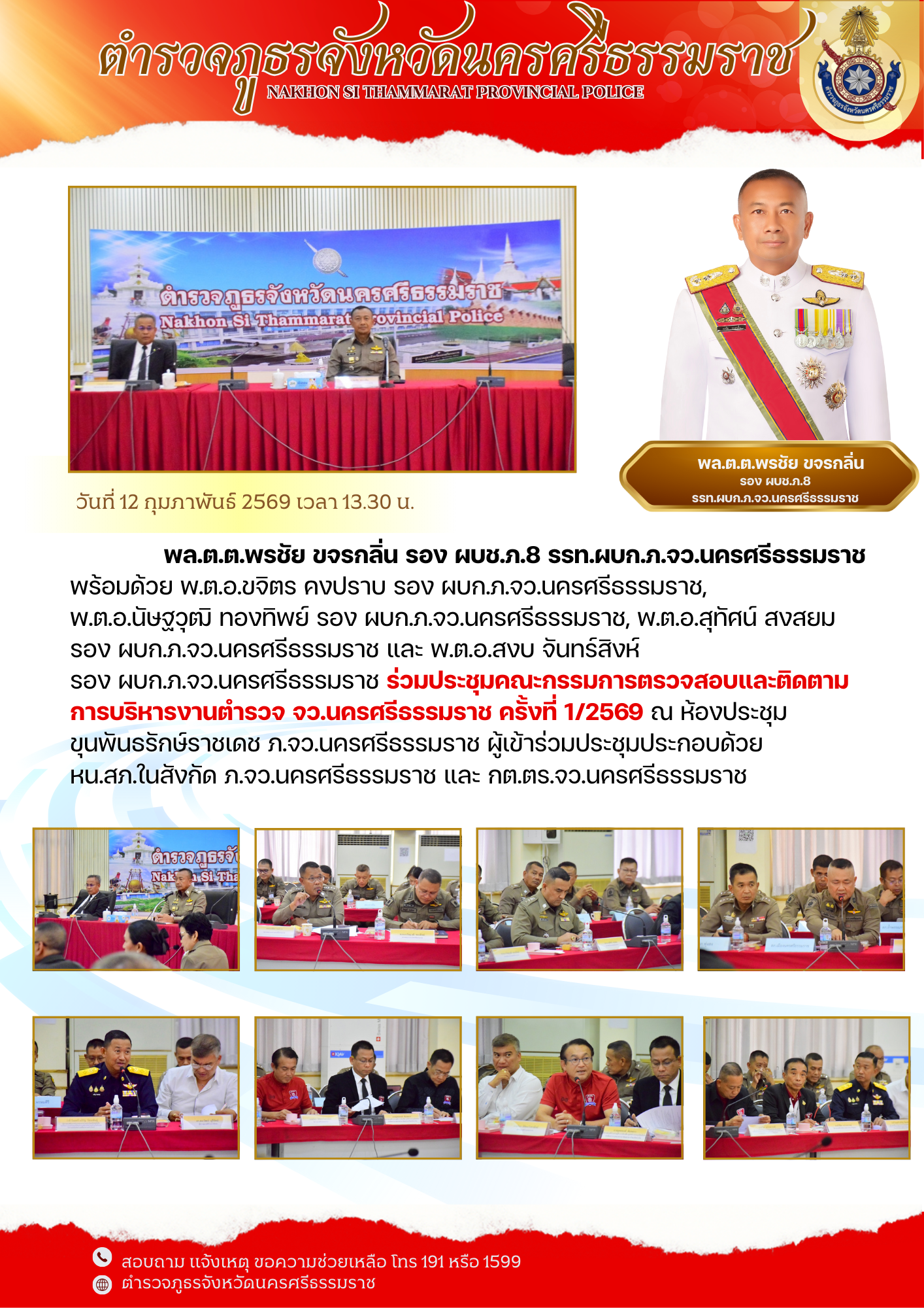 วันที่ 12 ก.พ.69 เวลา 13.30 น. ประชุมคณะกรรมการตรวจสอบและติดตามการบริหารงานตำรวจ จว. นครศรีธรรมราช ครั้งที่ 1/2569 ณ ห้องประชุมขุนพันธรักษ์ราชเดช ภ.จว.นครศรีธรรมราช February 13, 2569 by admin