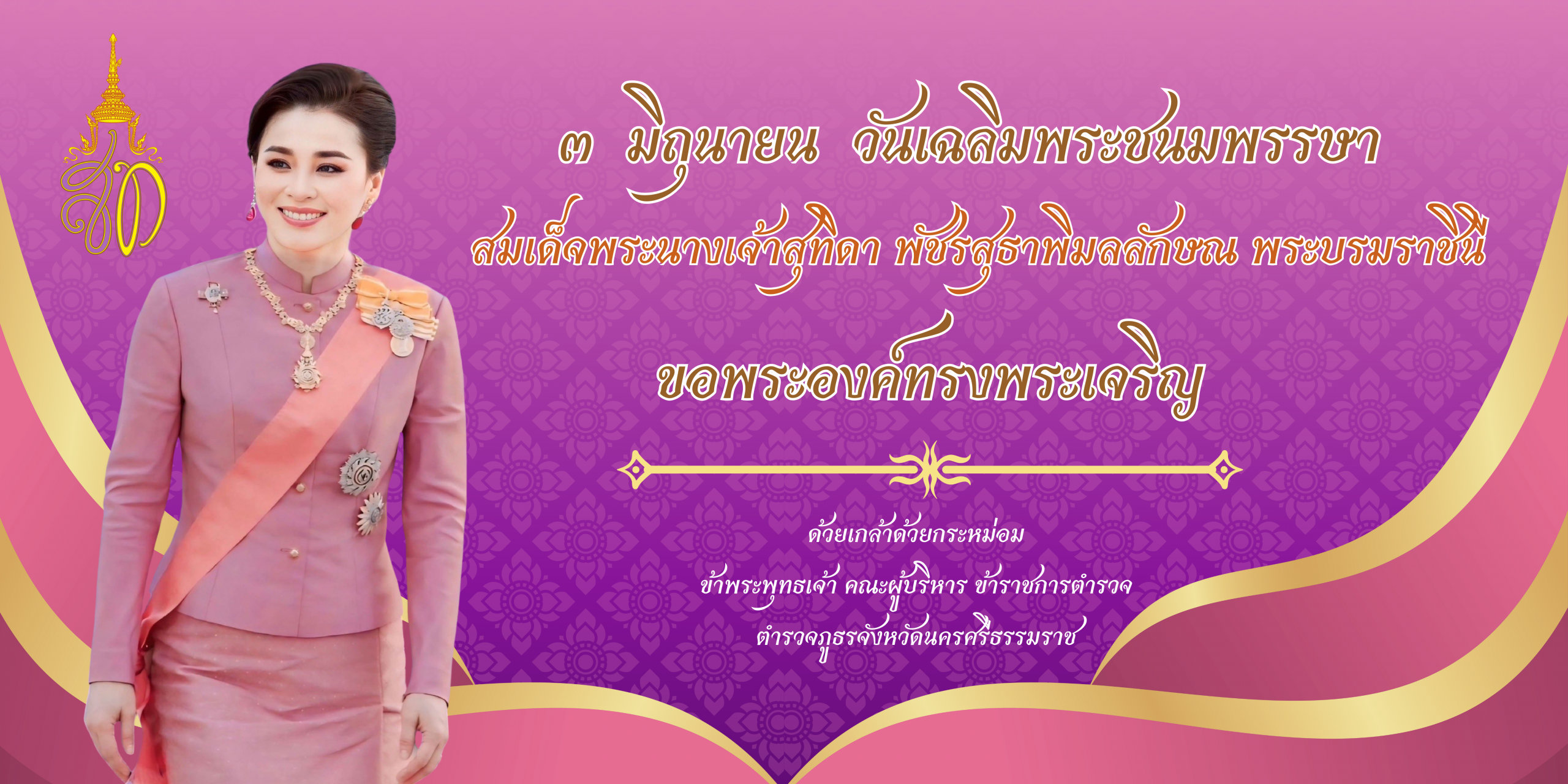 23 พ.ค. 68 เวลาประมาณ 08.10 น. สมเด็จพระกนิษฐาธิราชเจ้า กรมสมเด็จพระเทพรัตนราชสุดา เจ้าฟ้ามหาจักรีสิรินธร มหาวชิราลงกรณวรราชภักดี สิริกิจการิณีพีรยพัฒน รัฐสีมาคุณากรปิยชาติ สยามบรมราชกุมารี เสด็จฯ โดยรถยนต์พระที่นั่งไปยังสนามเฮลิคอปเตอร์ชั่วคราวค่ายวชิราวุธ ทรงประทับเฮลิคอปเตอร์พระที่นั่ง เสด็จฯ ไปยังโรงเรียนตำรวจตระเวนชายแดนท่านผู้หญิงอังกาบ บุณยัษฐิติ (บ้านคลองวาย) อำเภอวิภาวดี จังหวัดสุราษฎร์ธานี พล.ต.ต.จารุต ศรุตยาพร ผบก.ภ.จว.นครศรีธรรมราช คุณ จิราพร สงสยม รองประธานแม่บ้านตำรวจภูธรจังหวัดนครศรีธรรมราชพร้อมด้วยคณะแม่บ้านตำรวจภูธรจังหวัดนครศรีธรรมราช และข้าราชการตำรวจในสังกัด ภ.จว.นครศรีธรรมราช เฝ้าฯ ส่งเสด็จ น้อมเกล้าฯ ถวายกระเช้าของที่ระลึก ณ สนามเฮลิคอปเตอร์ชั่วคราวค่ายวชิราวุธ กองทัพภาคที่ 4 จังหวัดนครศรีธรรมราช