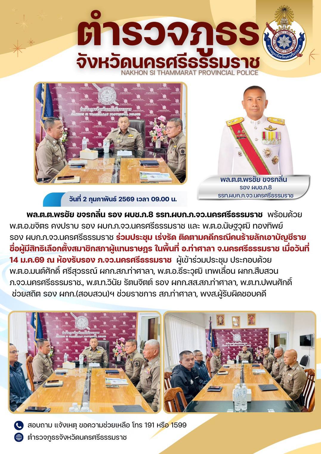 วันที่ 2 ก.พ.69 เวลา 09.00 น. พล.ต.ต.พรชัย ขจรกลิ่น รอง ผบช.ฯ รรท.ผบก.ภ.จว.นครศรีธรรมราช ร่วมประชุม เร่งรัด ติดตามคดีกรณีคนร้ายลักเอาบัญชีรายชื่อผู้มีสิทธิเลือกตั้งสมาชิกสภาผู้แทนราษฎร ในพื้นที่ อ.ท่าศาลา จ.นครศรีธรรมราช เมื่อวันที่ 14 ม.ค.69 February 4, 2569 by admin