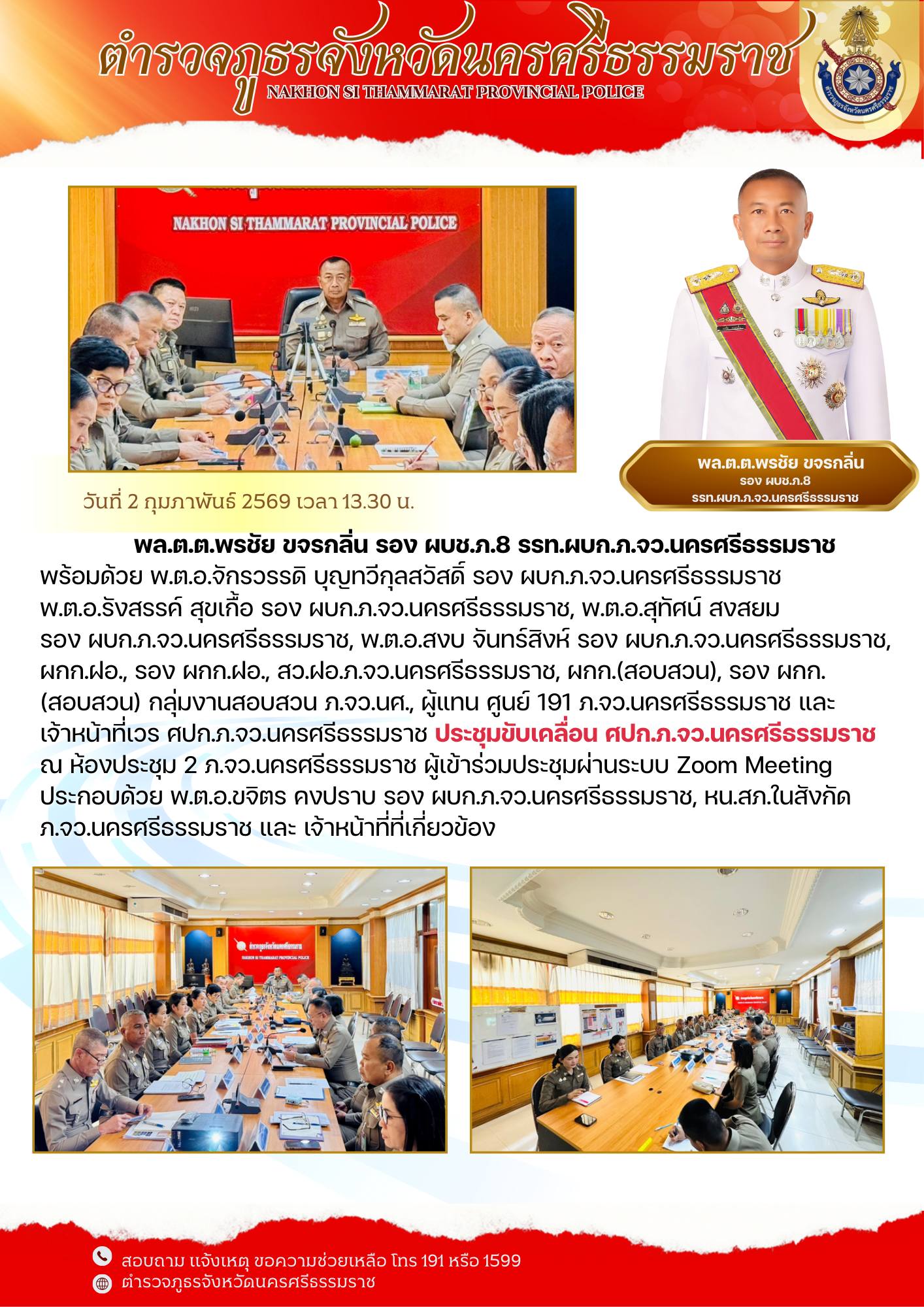 วันที่ 2 ก.พ69 เวลา 13.30 น. พล.ต.ต.พรชัย ขจรกลิ่น รอง ผบช.ฯ รรท.ผบก.ภ.จว.นครศรีธรรมราช ประชุมขับเคลื่อน ศปก.ตร. February 4, 2569 by admin