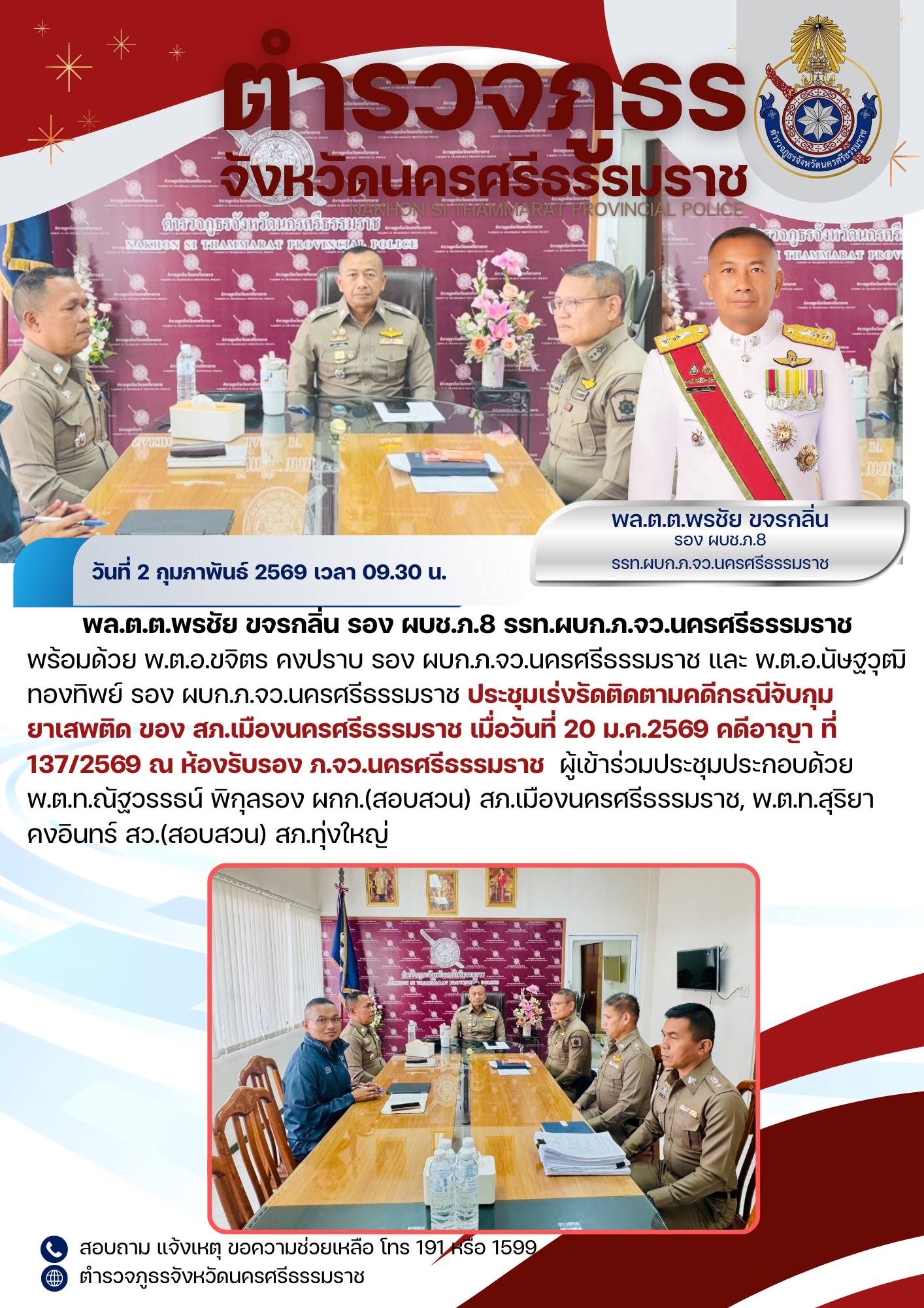 วันที่ 2 ก.พ.69 เวลา 09.30 น. พล.ต.ต.พรชัย ขจรกลิ่น รอง ผบช.ภ.8 รรท.ผบก.ภ.จว.นครศรีธรรมราช ประชุมเร่งรัดติดตามคดีกรณีจับกุมยาเสพติด ของ สภ.เมืองนครศรีธรรมราช เมื่อวันที่ 20 ม.ค.2569 คดีอาญาที่ 137/2569 February 4, 2569 by admin
