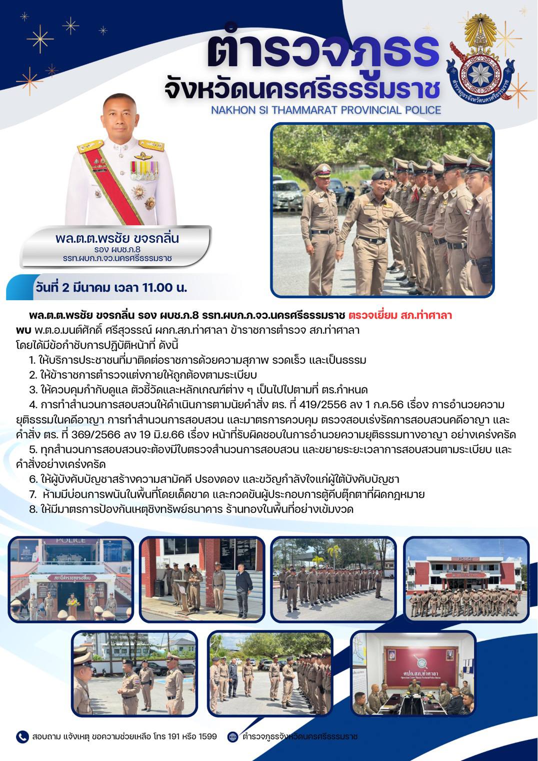 วันที่ 16 มี.ค.69 เวลา 10.00 น. พล.ต.ต.พรชัย ขจรกลิ่น รอง ผบช.ฯ รรท.ผบก.ภ.จว.นครศรีธรรมราช ตรวจเยี่ยม สภ.เฉลิมพระเกียรติ March 17, 2569 by admin