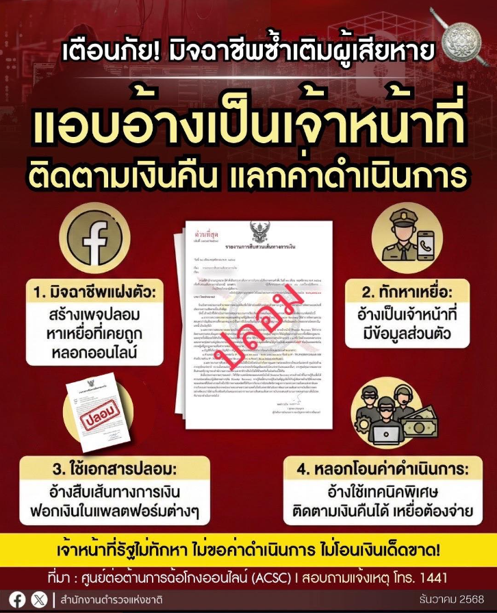 🚨อย่าหลงกล อุบายมิจจี้⚠️ สำนักงานตำรวจแห่งชาติเตือนภัย มิจฯหลอกลวงซ้ำเติมผู้เสียหาย แอบอ้างเป็นเจ้าหน้าที่ติดตามเงินคืนแลกค่าดำเนินการ December 16, 2568 by admin