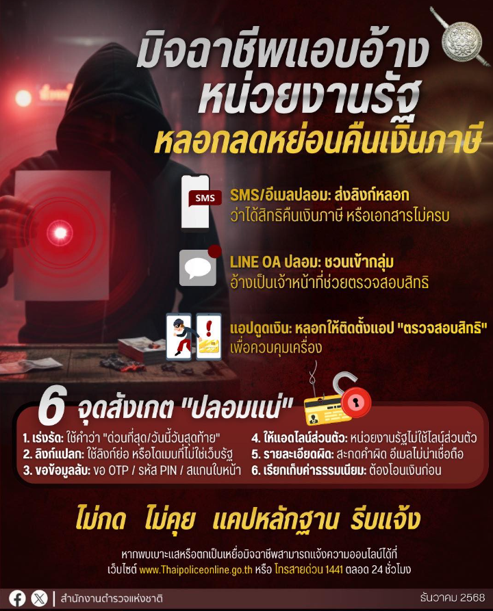 อย่าเชื่อ!! มุกแอบอ้างหน่วยงานรัฐหลอกลดหย่อนภาษี ล้วงข้อมูล ลวงโอนเงิน ที่มาในรูปแบบ SMS ปลอม ไลน์ปลอม แอปควบคุมโทรศัพท์มือถือ December 18, 2568 by admin